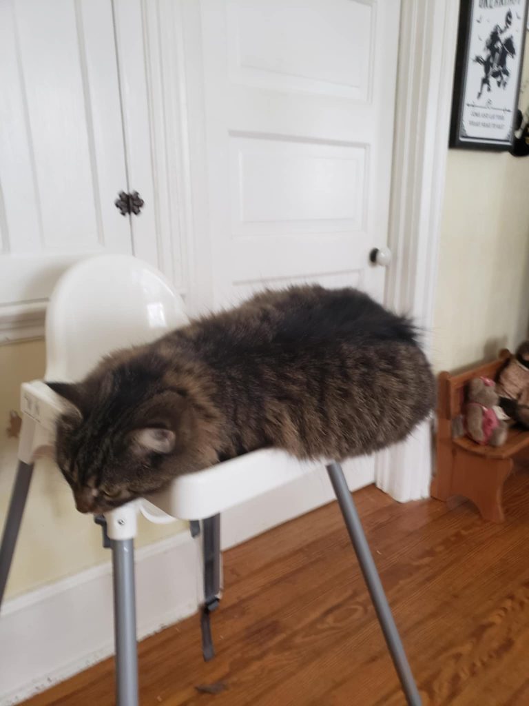 Happy timezones, cat lovers and friends! Today, Binx sat in the Littlest Little’s high chair! He said, “Mama, where all da shnacks?” When I told him he was too big to sit like that, he decided to stretch across the tray instead! Eventually, I did give him his snickety-snack, so don’t feel too badly for him even though he meows like he hasn’t been fed in a month!