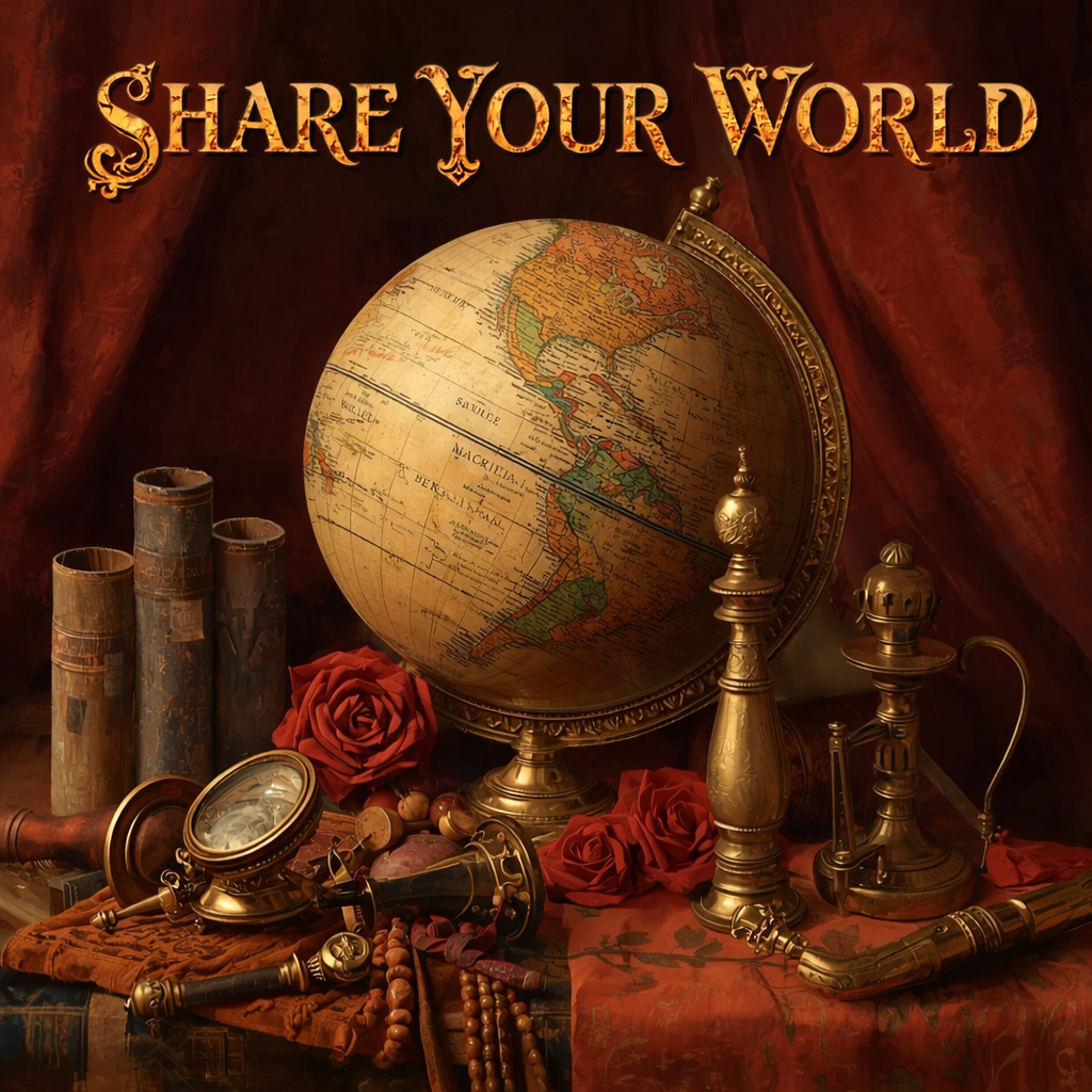 Two hands holding a glass globe representing Earth over a reflective water surface, with the phrase 'Share Your World' in the bottom right corner.