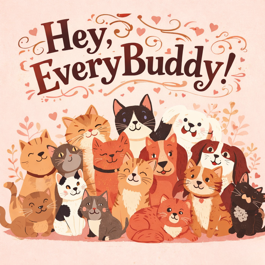 A cheerful graphic featuring a golden retriever and a Labrador puppy, along with two kittens, set against a light blue background with paw prints and the text 'Happy Tuesday!'